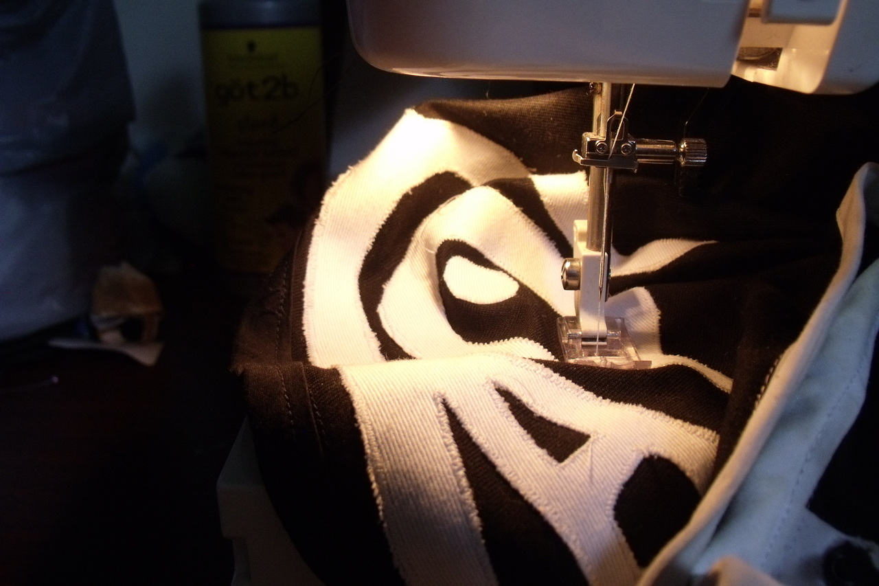 Fixing up the appliqué on the vest.