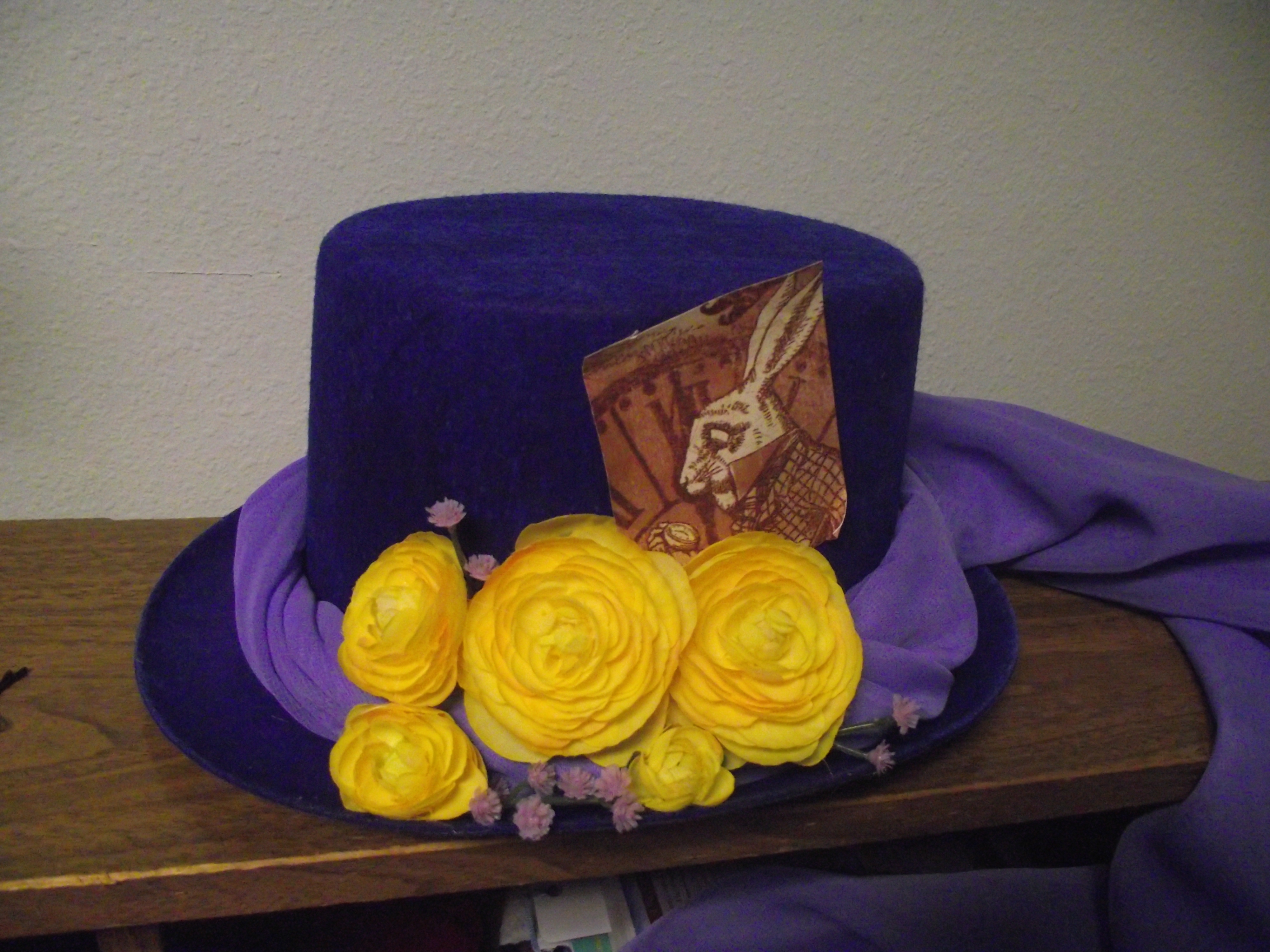The finished out-come of the hat. It was so much fun adding the details onto it. I wanted to keep it close to the original but add a bit of spice to it. Nic chose some old scrap booking paper and I created a Mad hatter broach (not seen) to the hat.