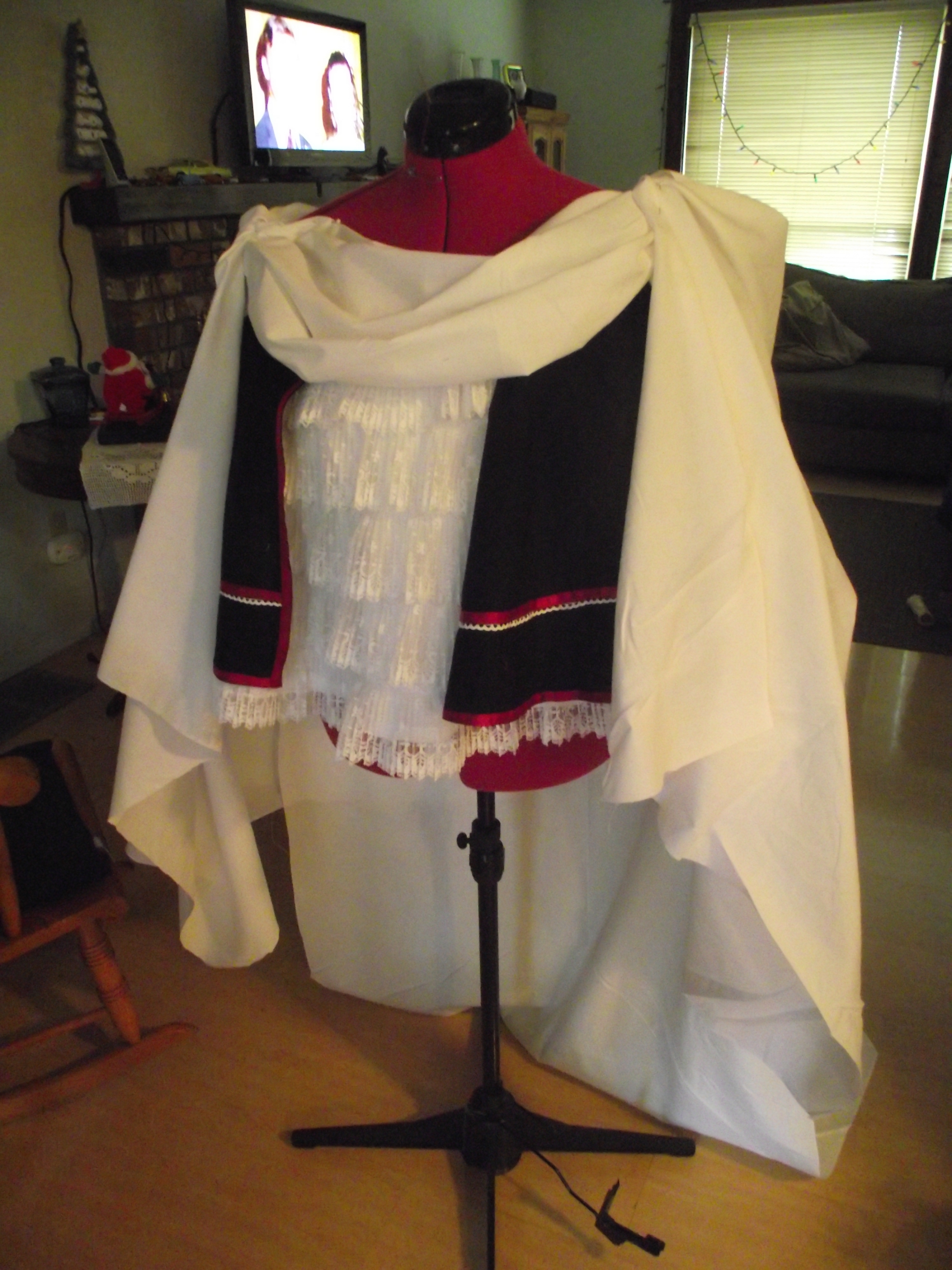 Mock-up for the green bustle. This was a challenge for me for I decided I needed to do a mock-up before cutting into my Kona Cotton and having to face a mess up. It was made up from three pieces.
