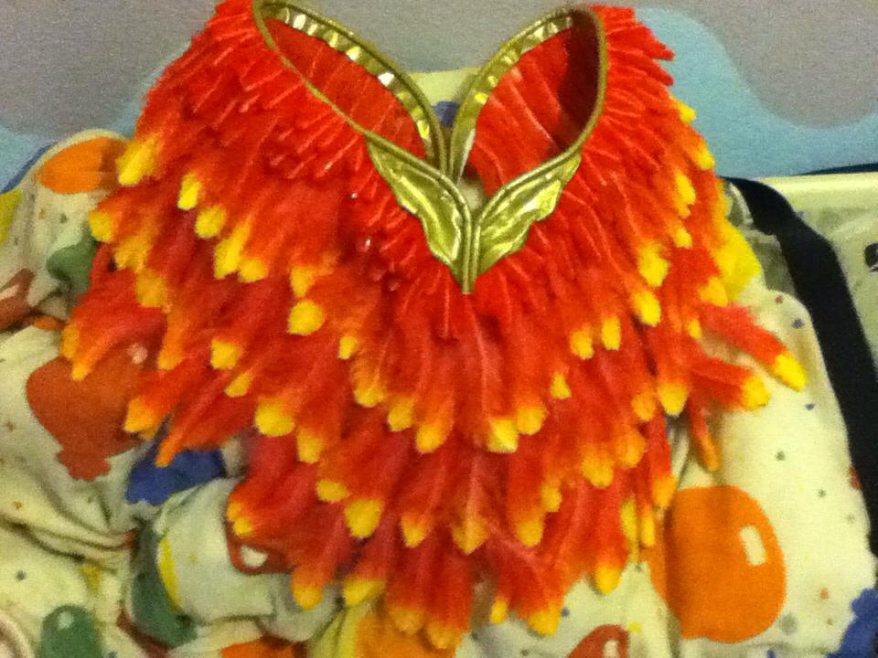 Each feather was hand made from white faux fur and then hand spray painted red and yellow. Took about 2 weeks to make 400-500 feathers and another week to actually make the skirt.
