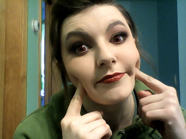 Make up test for Little Red Striding Hood. Yesterday my aviators broke (DRAT!), so figured I'd do some kind of creepy, Tim Burton-esque makeup with red circle lenses, figured the creepiness would juxtapose nicely with how saccharine the costume is