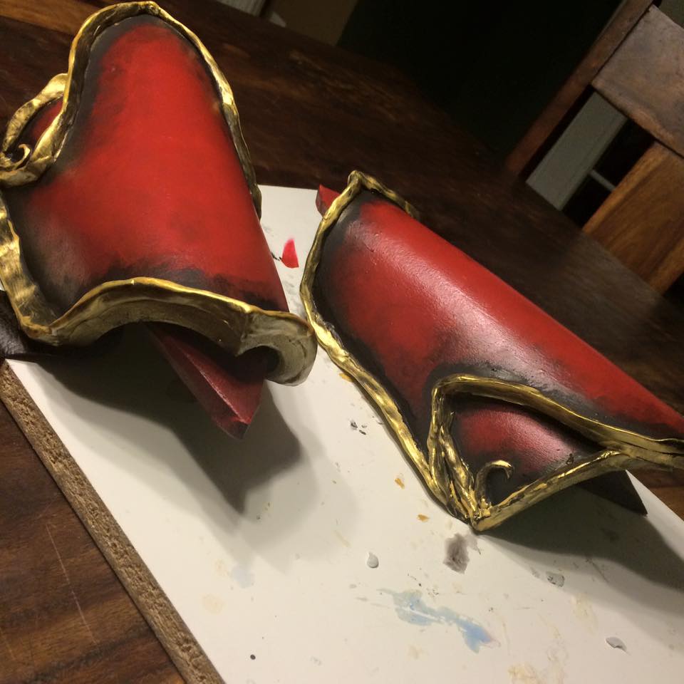 The bracers are made with EVA foam and the details are made with apoxie sculpt. I used 3 layers of modge podge to seal the foam, then painted them black. I started from the center and worked my way out with satin finish red acrylic paint. I dry brushed the gold onto the details, then added a line of gold to the raised parts of the details. Then, I went of the black edges again for contrast. They were sealed with 3 more ayers of modge podge in a matte finish, then attached with pleather strips and velcro.