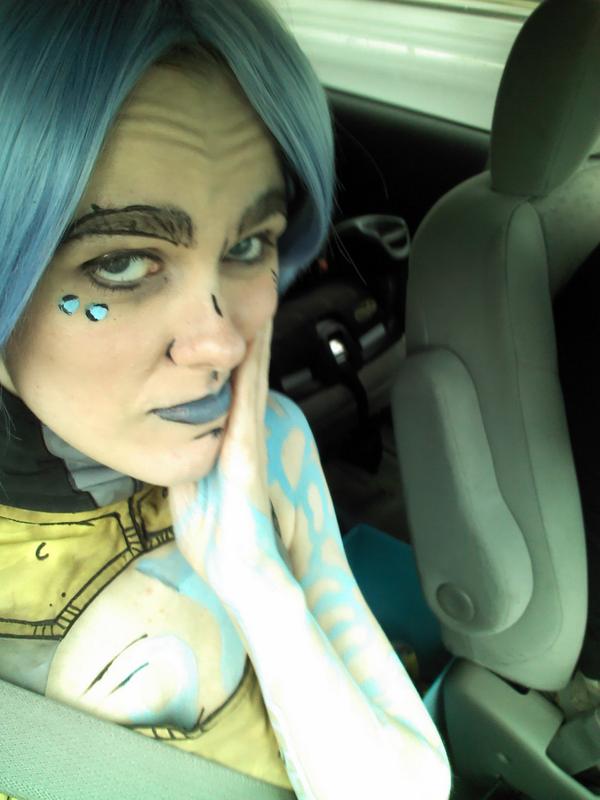 Several planets lined up to make my eye brows that bad. First I had only done one make-up test and never practiced cell shading. The morning of the con I decided to pluck my eyebrows for the first time in my entire life. My tweezers were nickle plated; I'm allergic to nickle. The eye shadow I used I had a reaction to in the past. So I have these giant open pores reacting to nickle and I fill them full of this eye shadow. Then I went to do cell shading with a brand new tube of liquid liner. I opened it and the brush was forked. So I was attempting to draw thin lines with that thing. The lines went on so thick. I wiped it off with a baby wipe and tried again, twice. By then I had been doing make-up for 4 hours and just wanted to be at PAX already. I camped by the computer for 3 weeks to get my one day pass and didn't want to spend the time doing make-up. I get coffee on the way. I didn't drink anything else all day because I didn't want to mess up my make-up. By the end of the day my right eyelid was so swollen then I had to put my hand on it to be able to see normally.