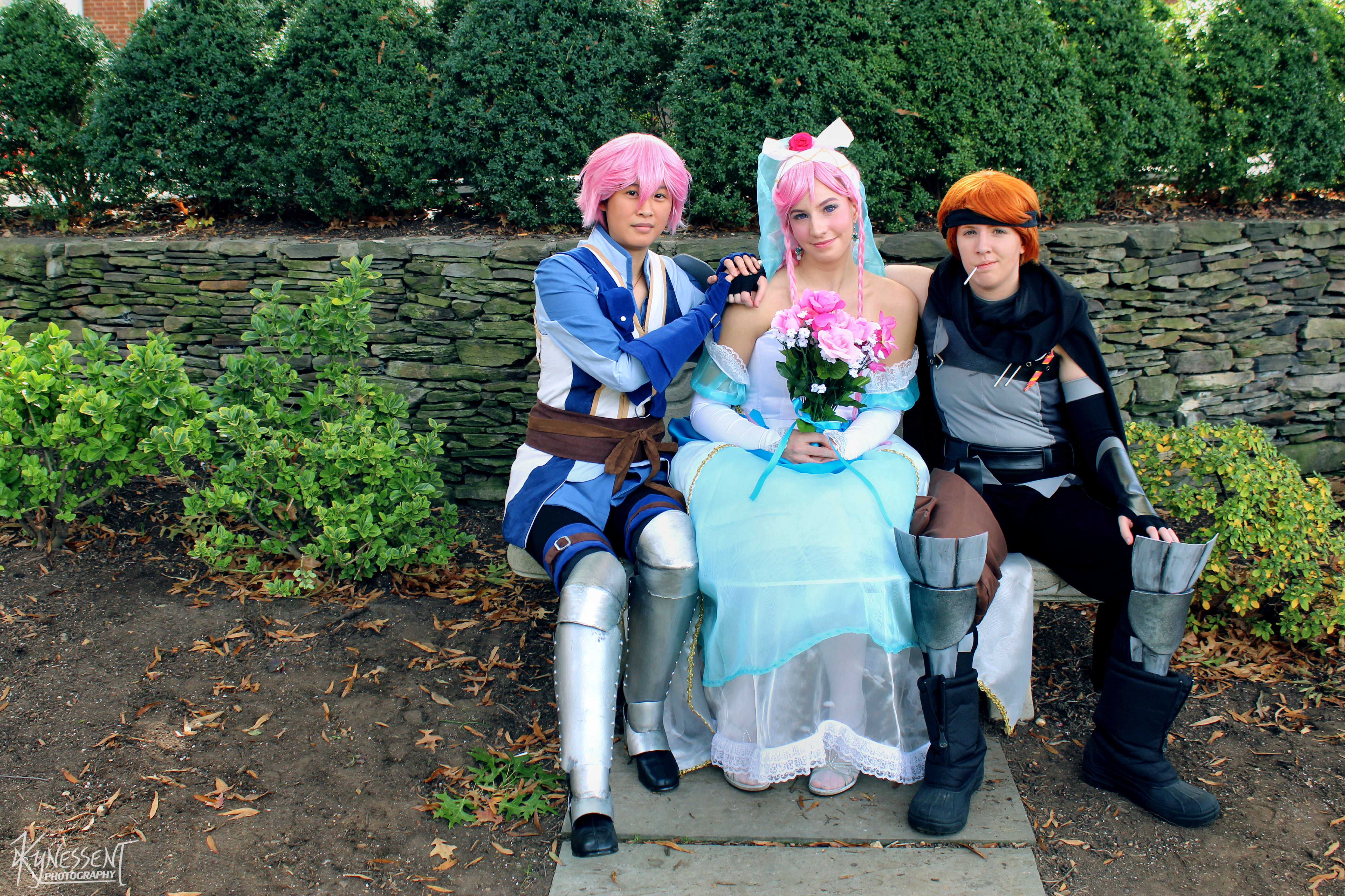 Cosplayers are Lady Arieta as Inigo, Ohimesama-chan Cosplay as Olivia (bride class), and CayLink & Aimeigh Cosplay as Gaius from Fire Emblem Awakening.