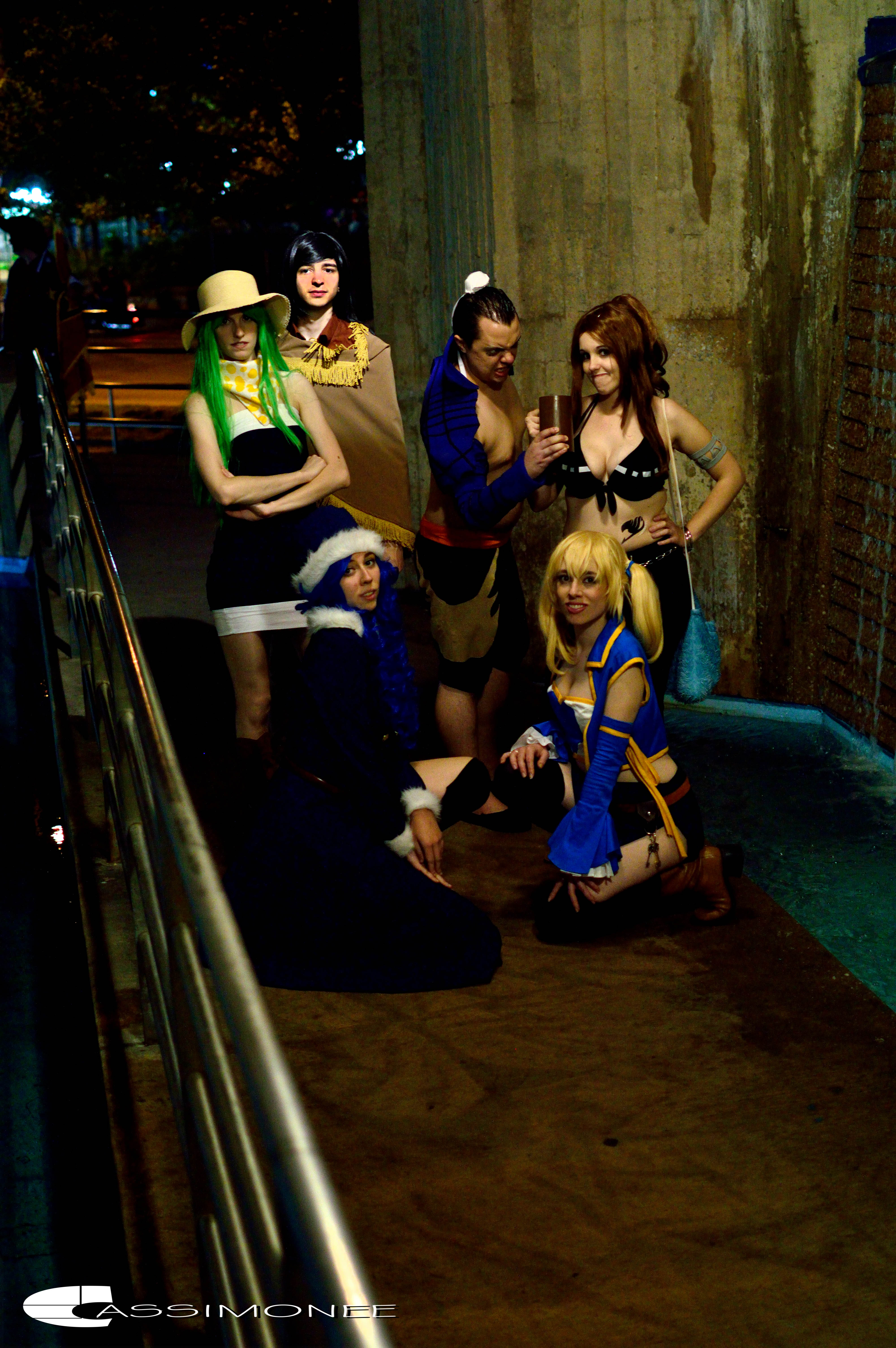 Photography by Cassimonee Photography. Taken at Otakon 2014. Dendensushi Cosplay as Bacchus, Terranell as Lucy, Layne as Juvia, Turkoff as Alzak, and Bui-Chan as Bisca.