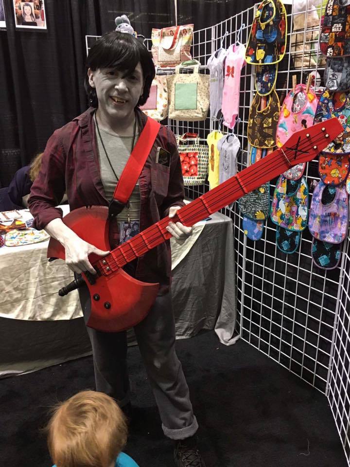 doing the makeup was harder than anticipated. I had hoped to have a gray stocking made to wear over the arms hands and upper body to save from doing makeup, but it wasn't ready. Therefore I labored with my face, neck area and lower arms, and decided to wear a long sleeve shirt so I didn't have to apply there. Face makeup ended up being a little too dark, while my arms are closer to the shade I want. In the end it went fine--people still recognized Marceline and liked it. Although it's more a transgender Marci/Marshall Lee version ha ha. Improvements will be made next time.