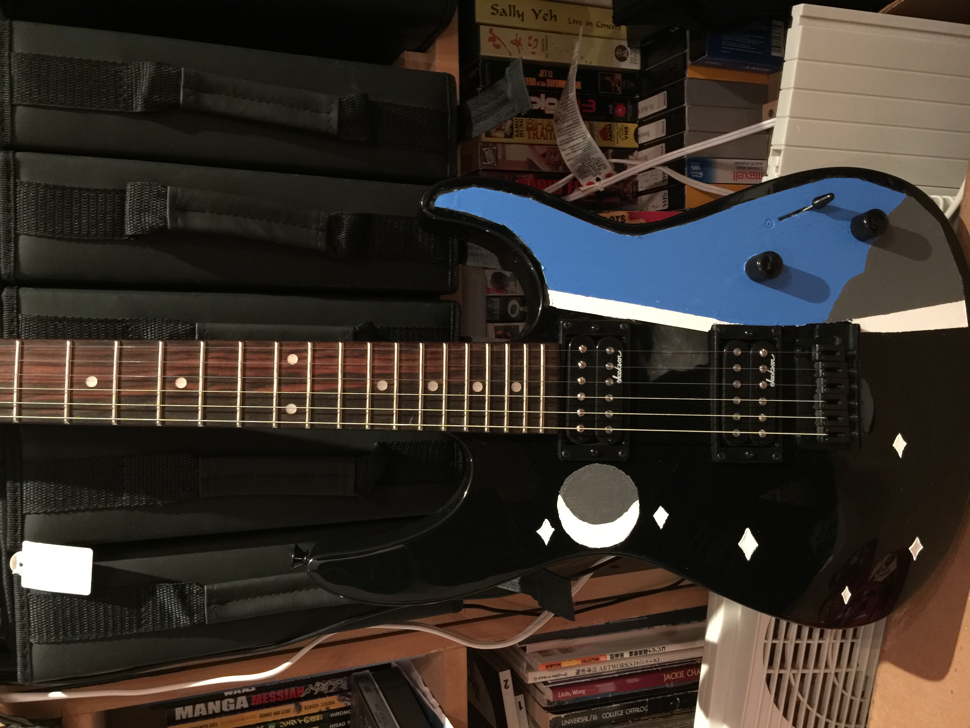 Voila! This was actually difficult to paint by hand, but less of a hassle than spray painting. Painted the blue, then the white stripe, then the stars and crescent moon. Sanded a little to smooth out, but I'll do more sanding later.