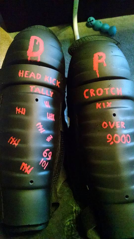 Shin guards that I found at Goodwill for $2 repainted and smartassed all up!